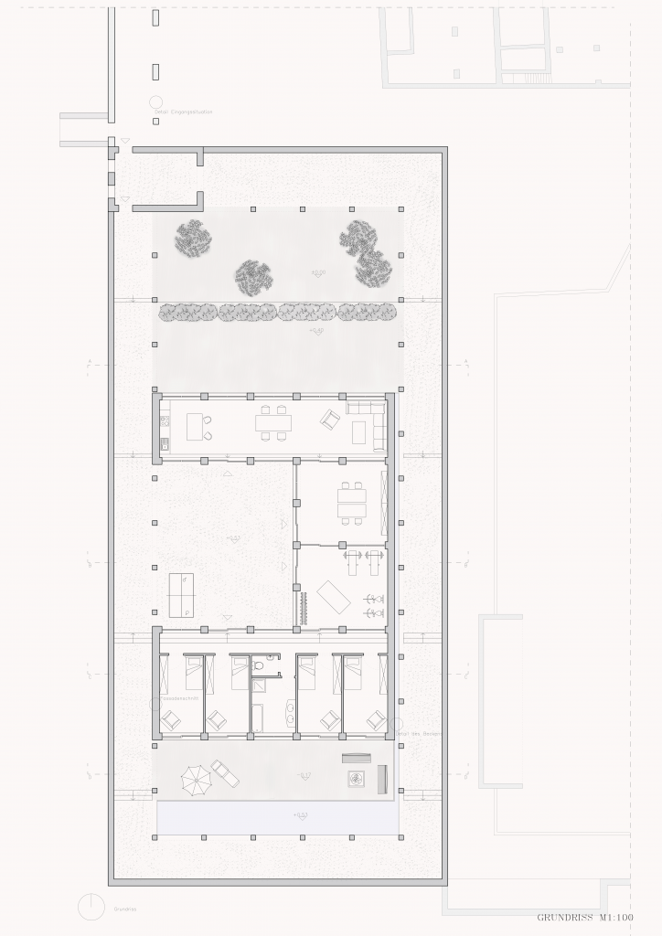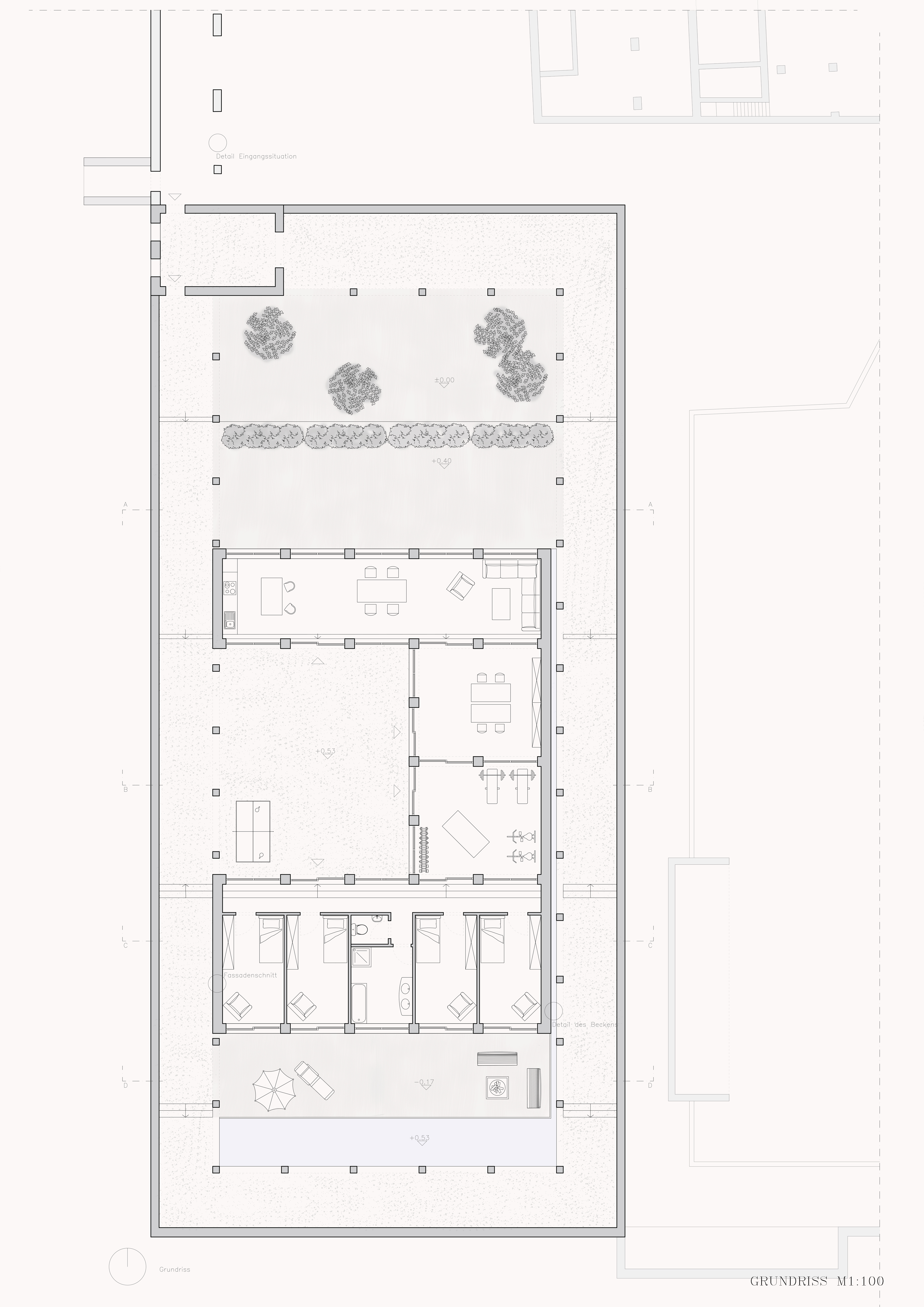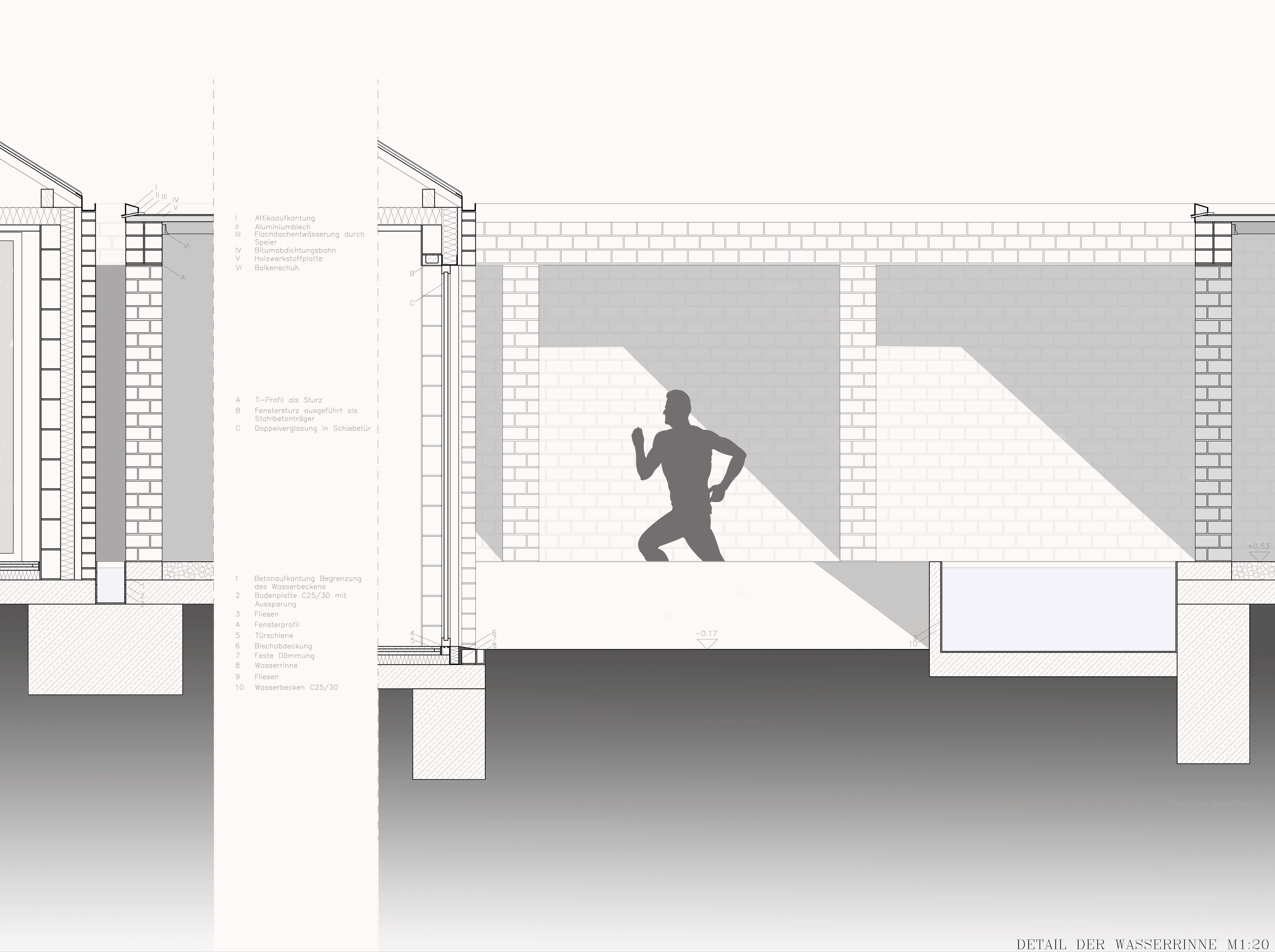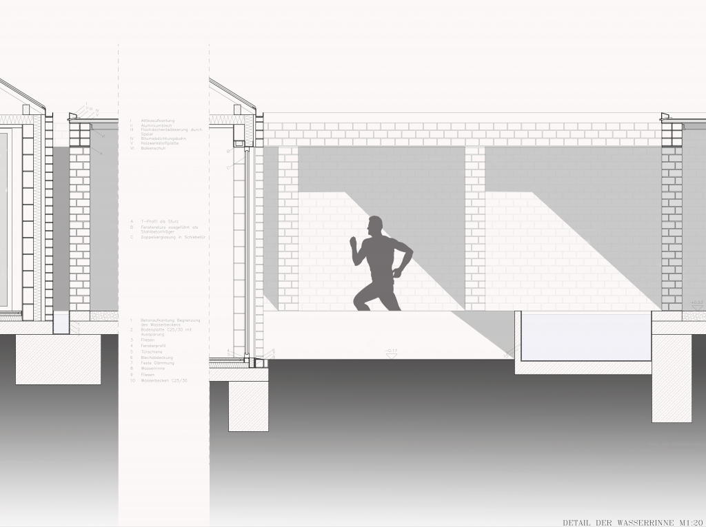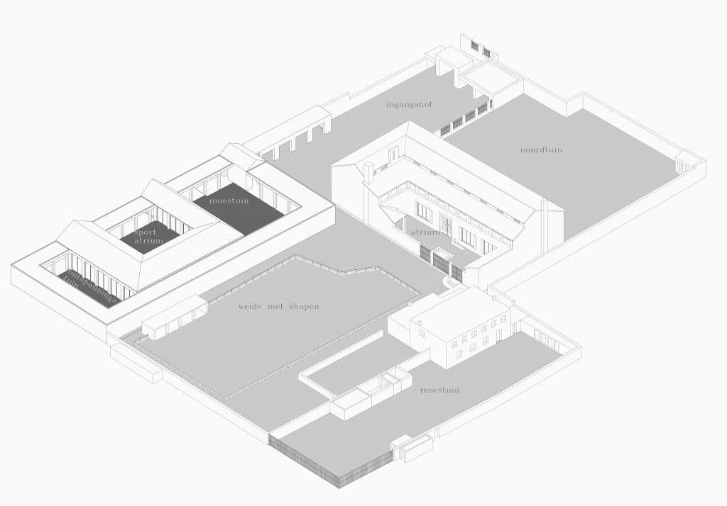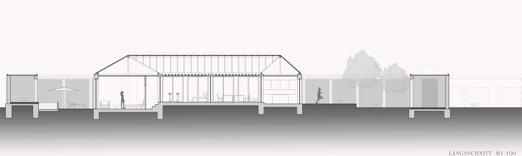 I referred here to Jan de Jong’s overall concept, in which he combines various buildings through courtyards to form an ensemble. The newly created guest house extends the existing buildings on a still undeveloped part of the property, which he saw as a possible building site. Here, three new courtyards are now created from the interplay of the courtyard house and the surrounding arcade, which are adapted to the life of the meeting sports and nutrition scientists.