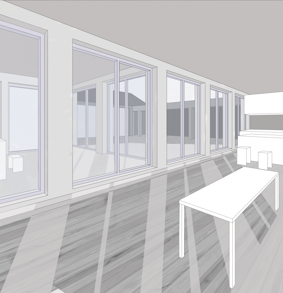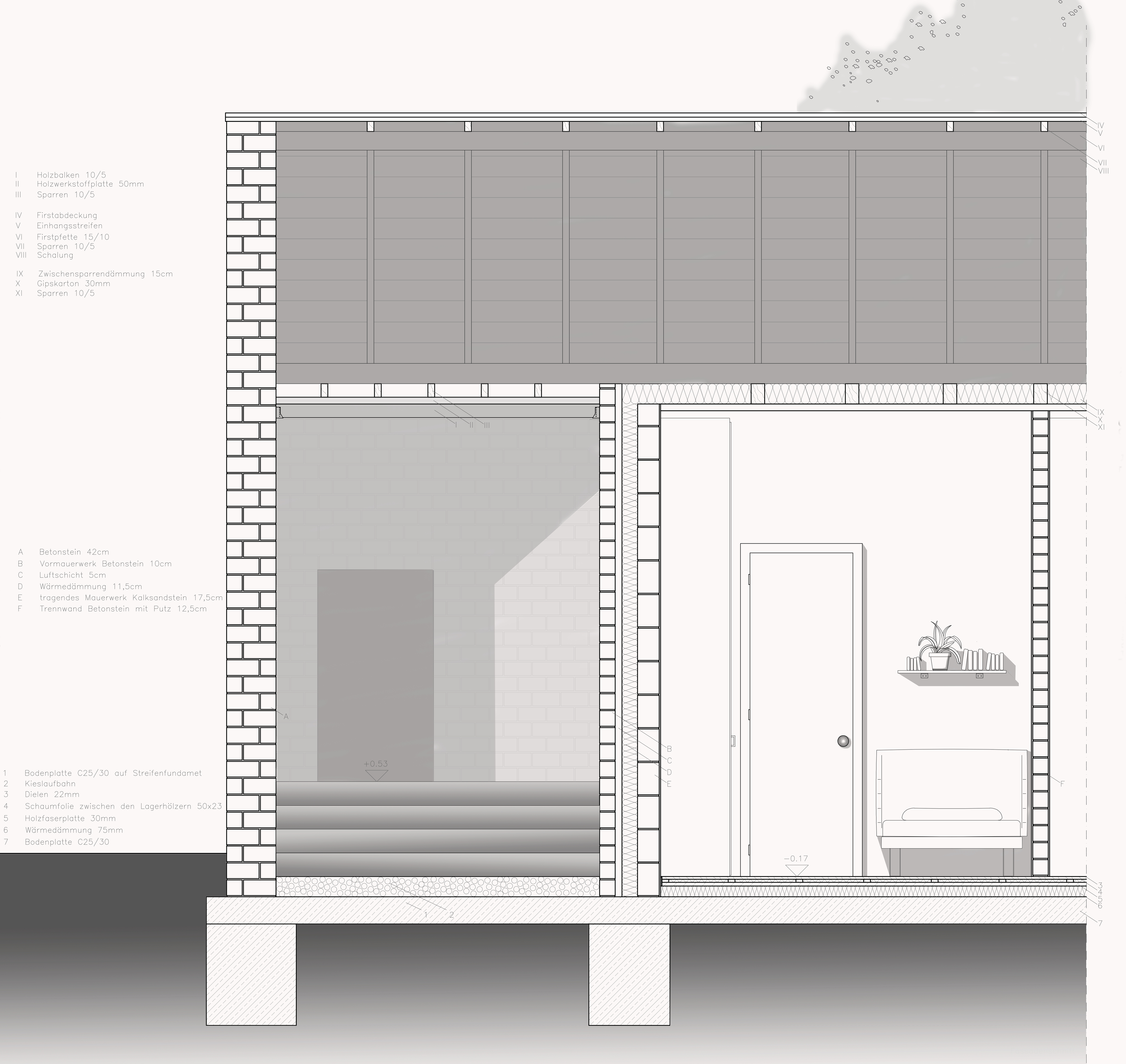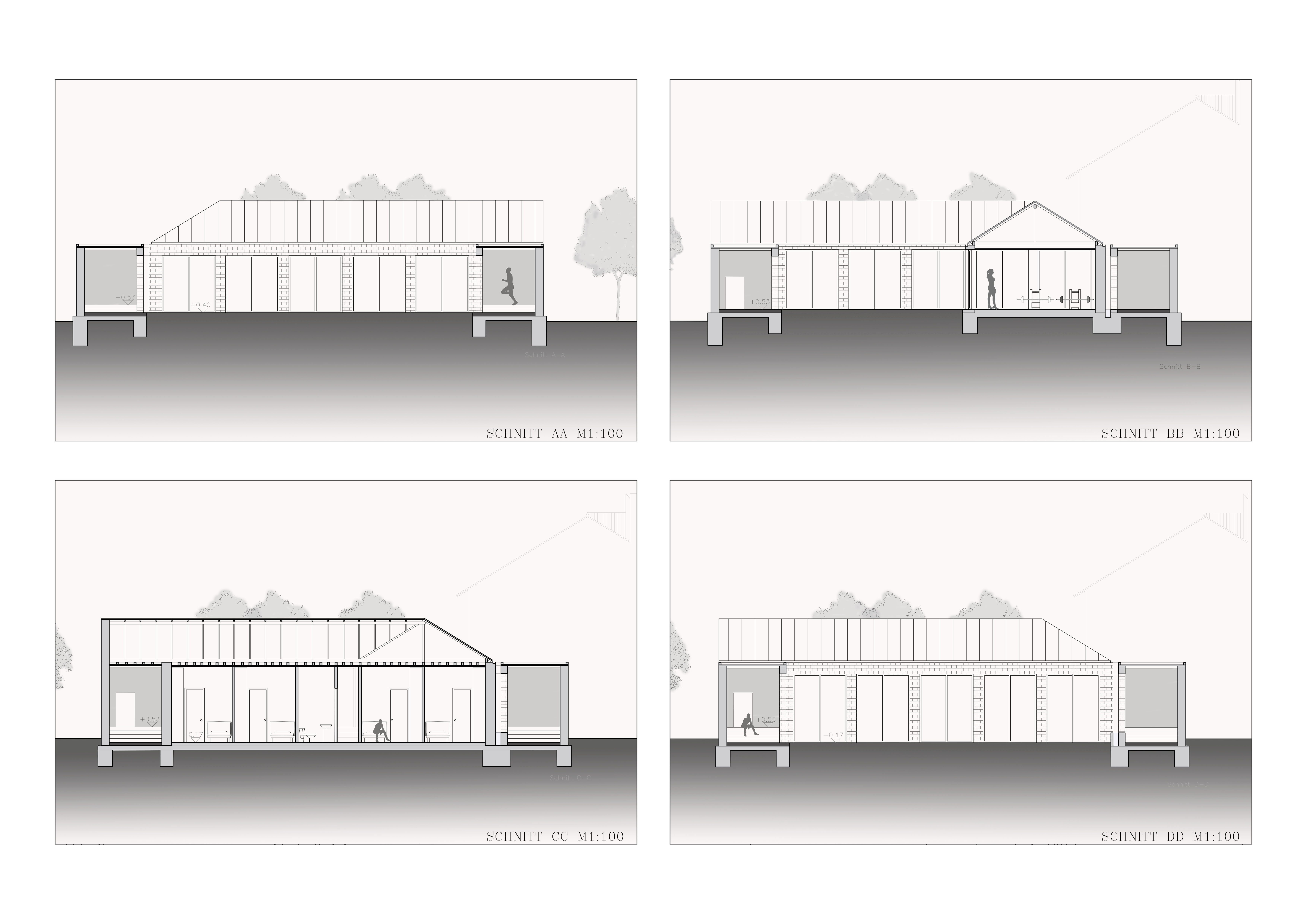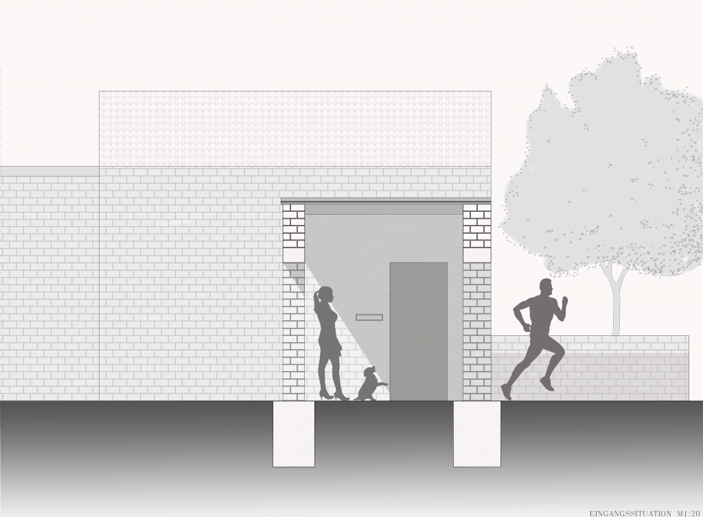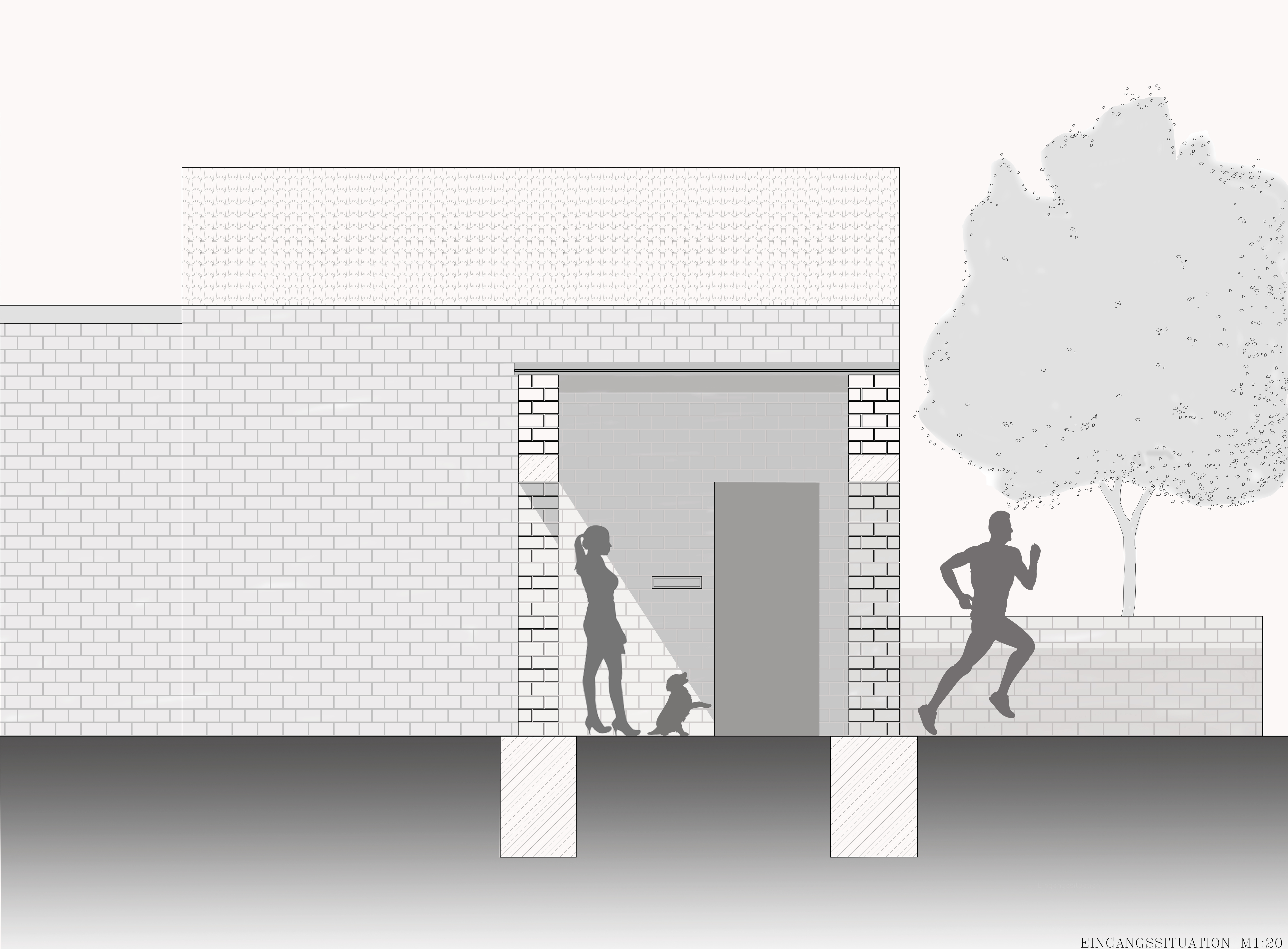 I referred here to Jan de Jong’s overall concept, in which he combines various buildings through courtyards to form an ensemble. The newly created guest house extends the existing buildings on a still undeveloped part of the property, which he saw as a possible building site. Here, three new courtyards are now created from the interplay of the courtyard house and the surrounding arcade, which are adapted to the life of the meeting sports and nutrition scientists.