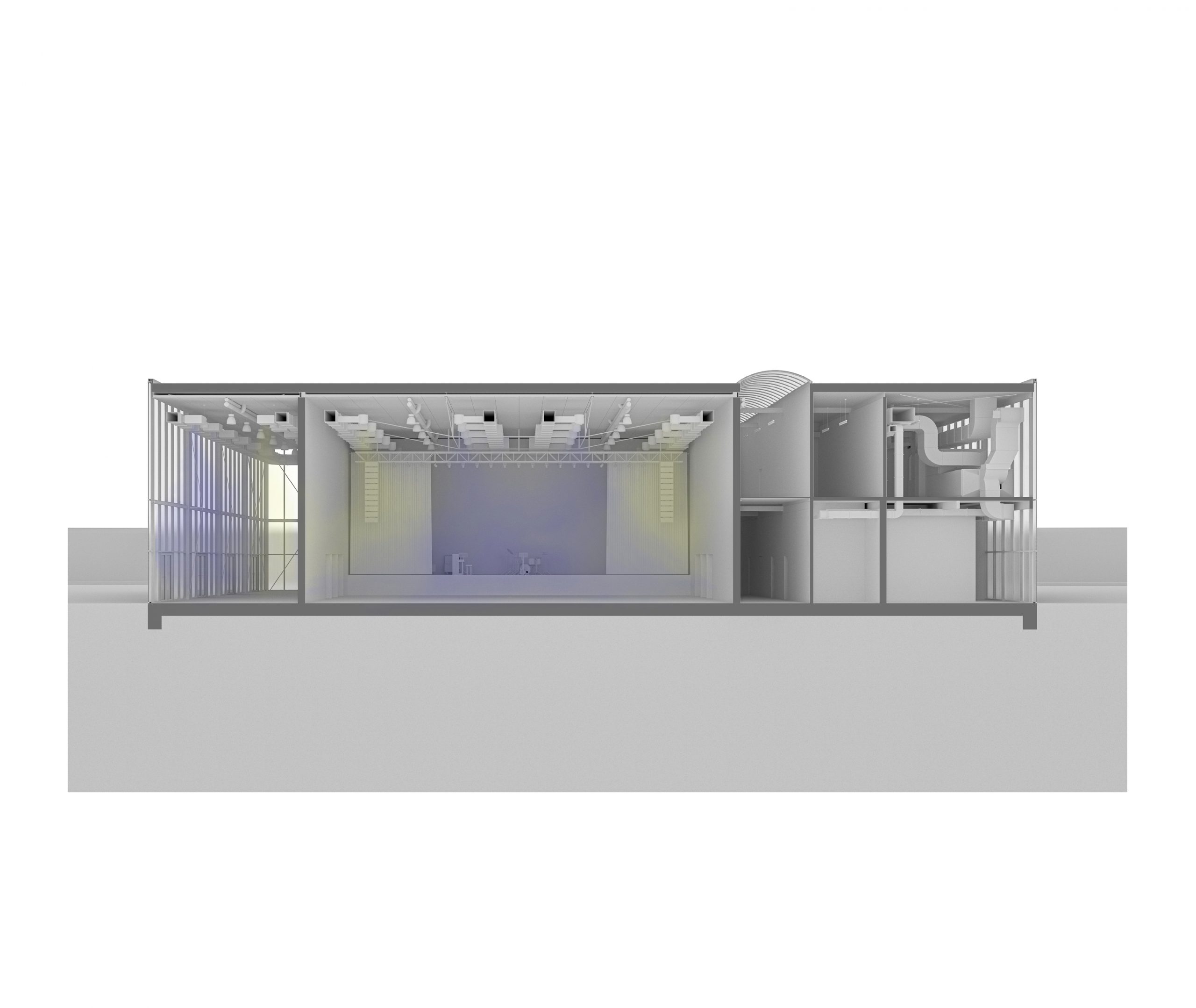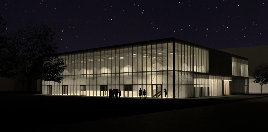 The façade consists of polycarbonate panels that clad the building all around and create an opaque appearance. The core of the building in which the hall is located is constructed as an infill with aerated concrete. On the inside of the hall, solid aerated concrete blocks alternate with perforated blocks to support the acoustics and counteract the echo.