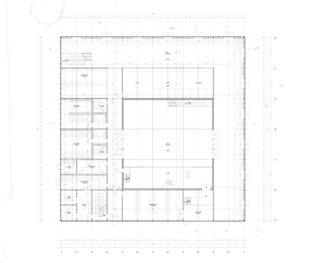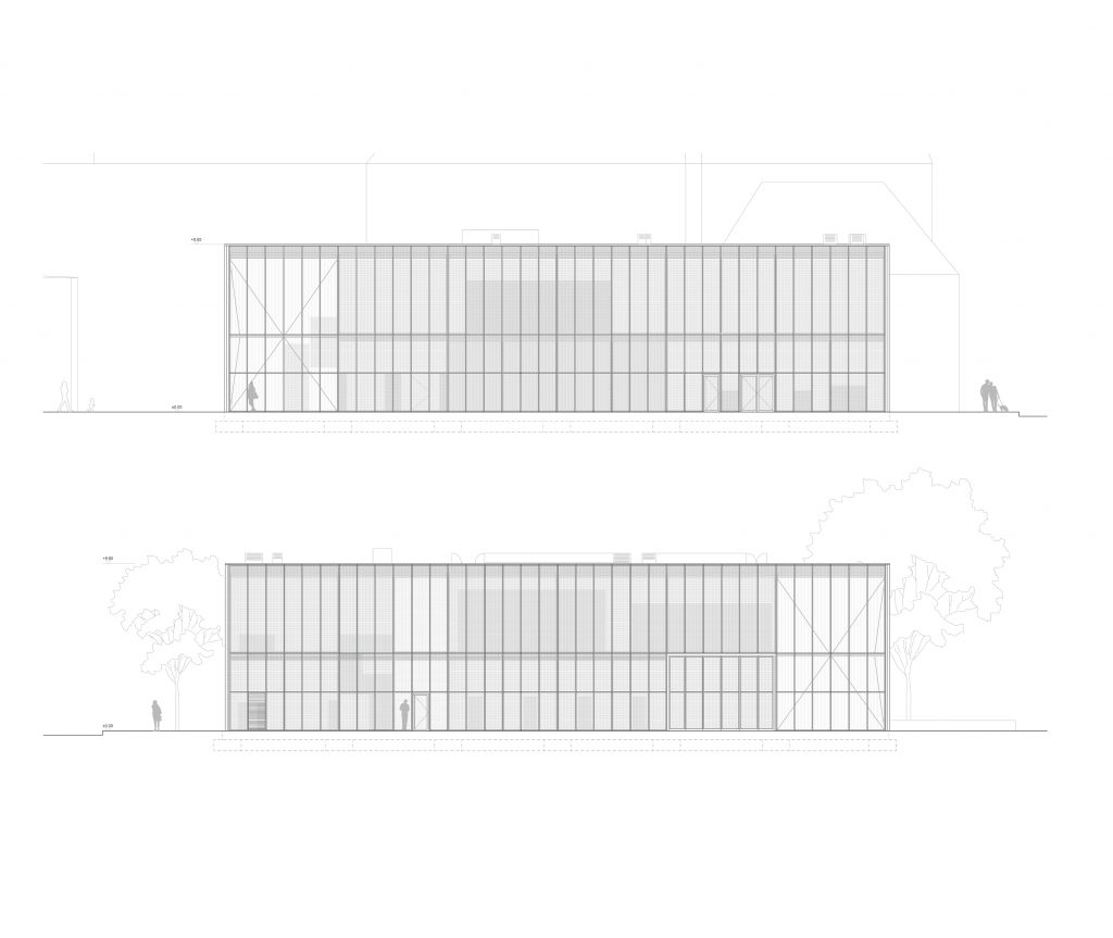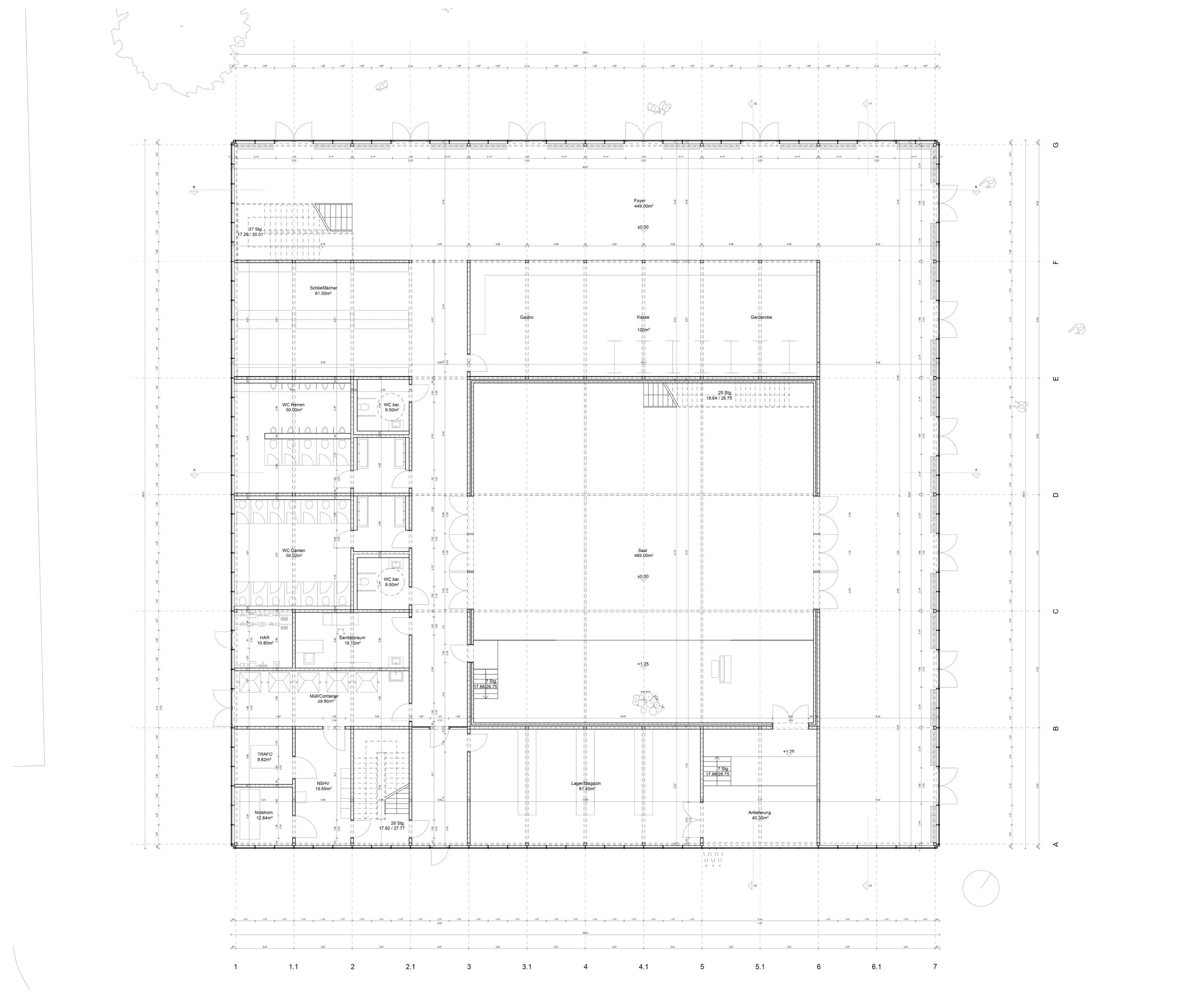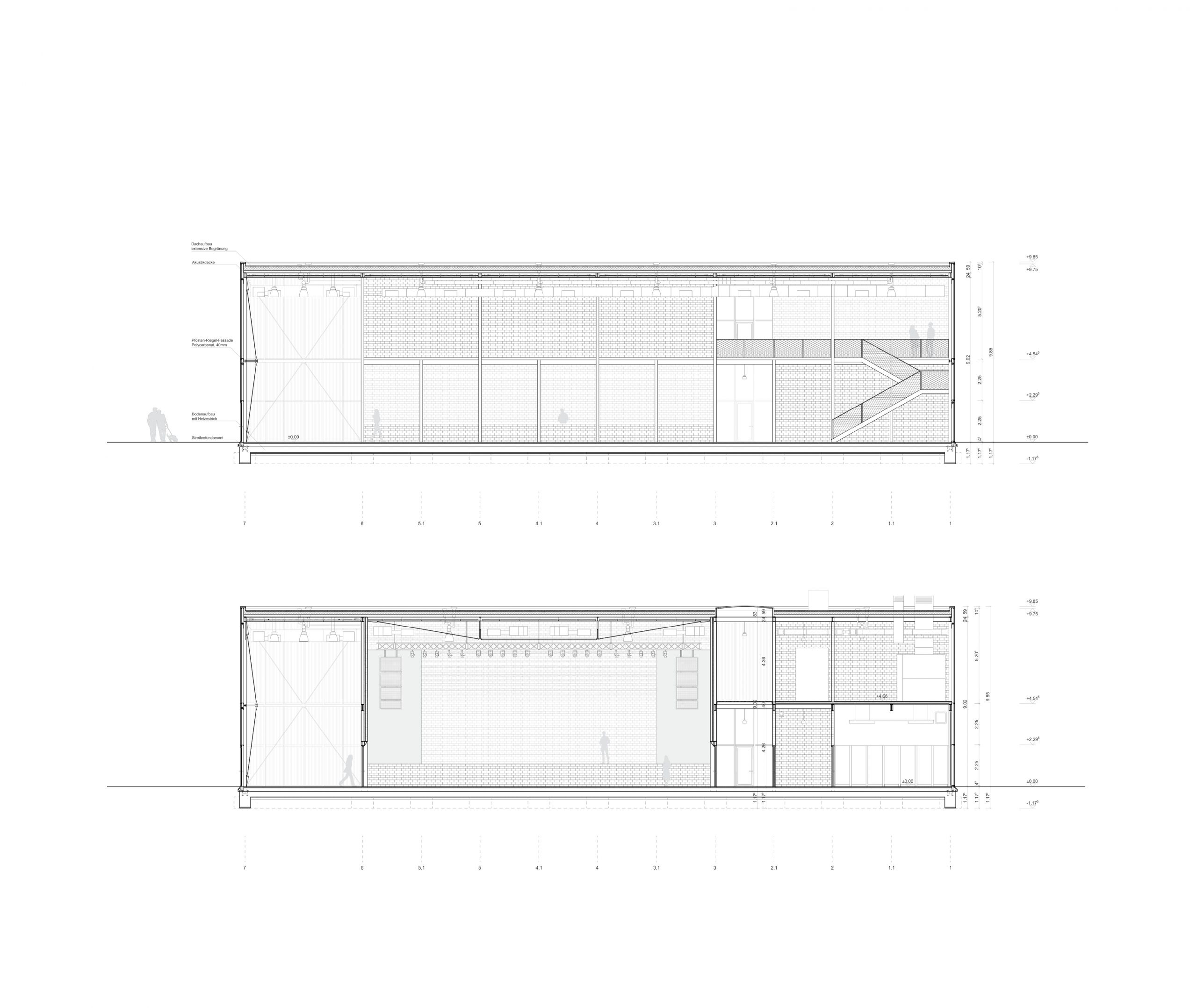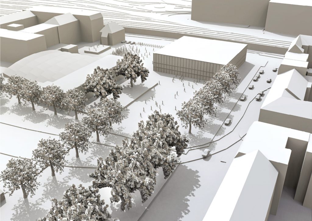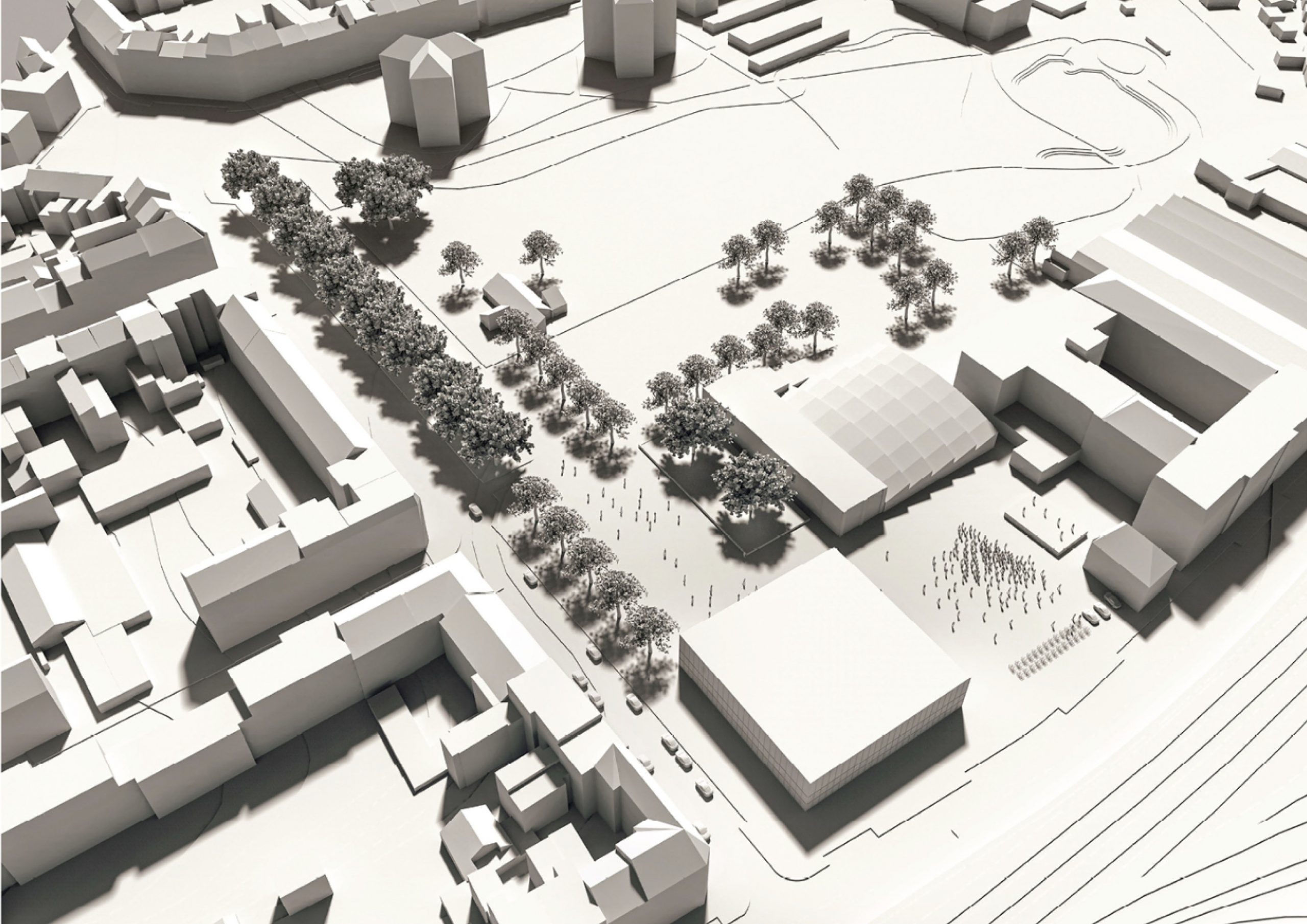 The hall opens up to the adjacent park on one side and extends it by an avenue. At the same time, it creates a space for open-air concerts, flea markets and other activities on the other side. The main entrance to the building faces the Kennedypark.