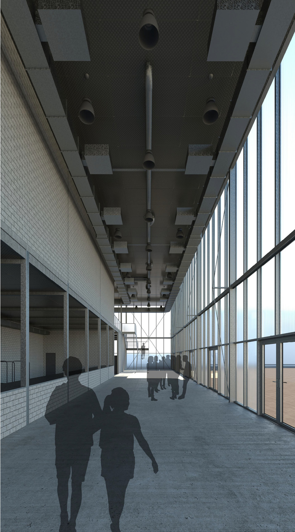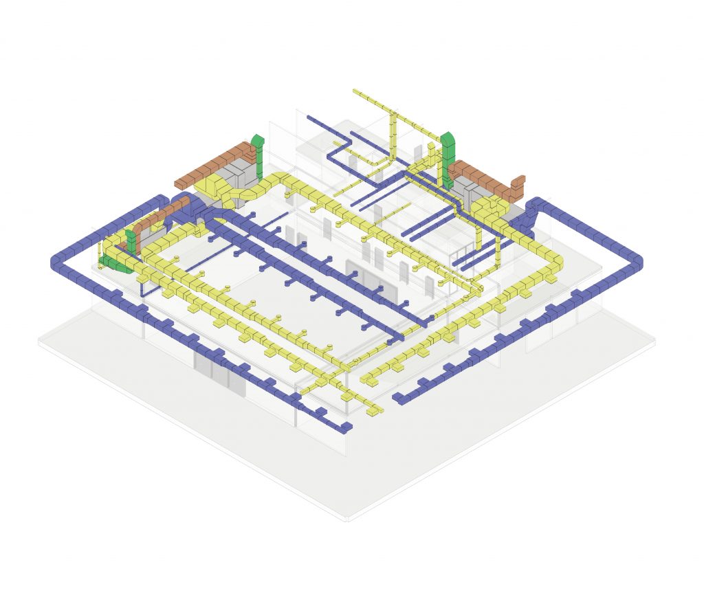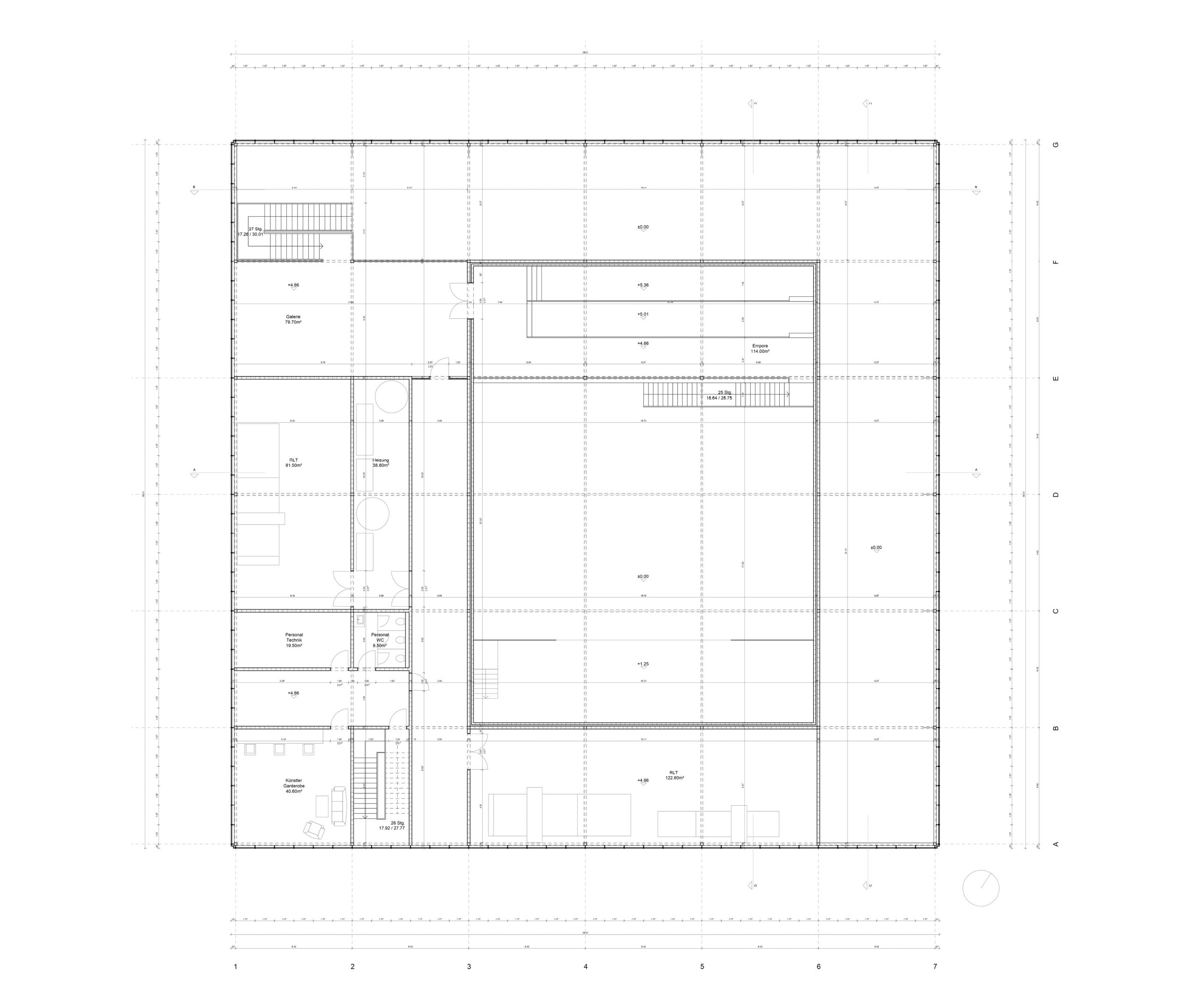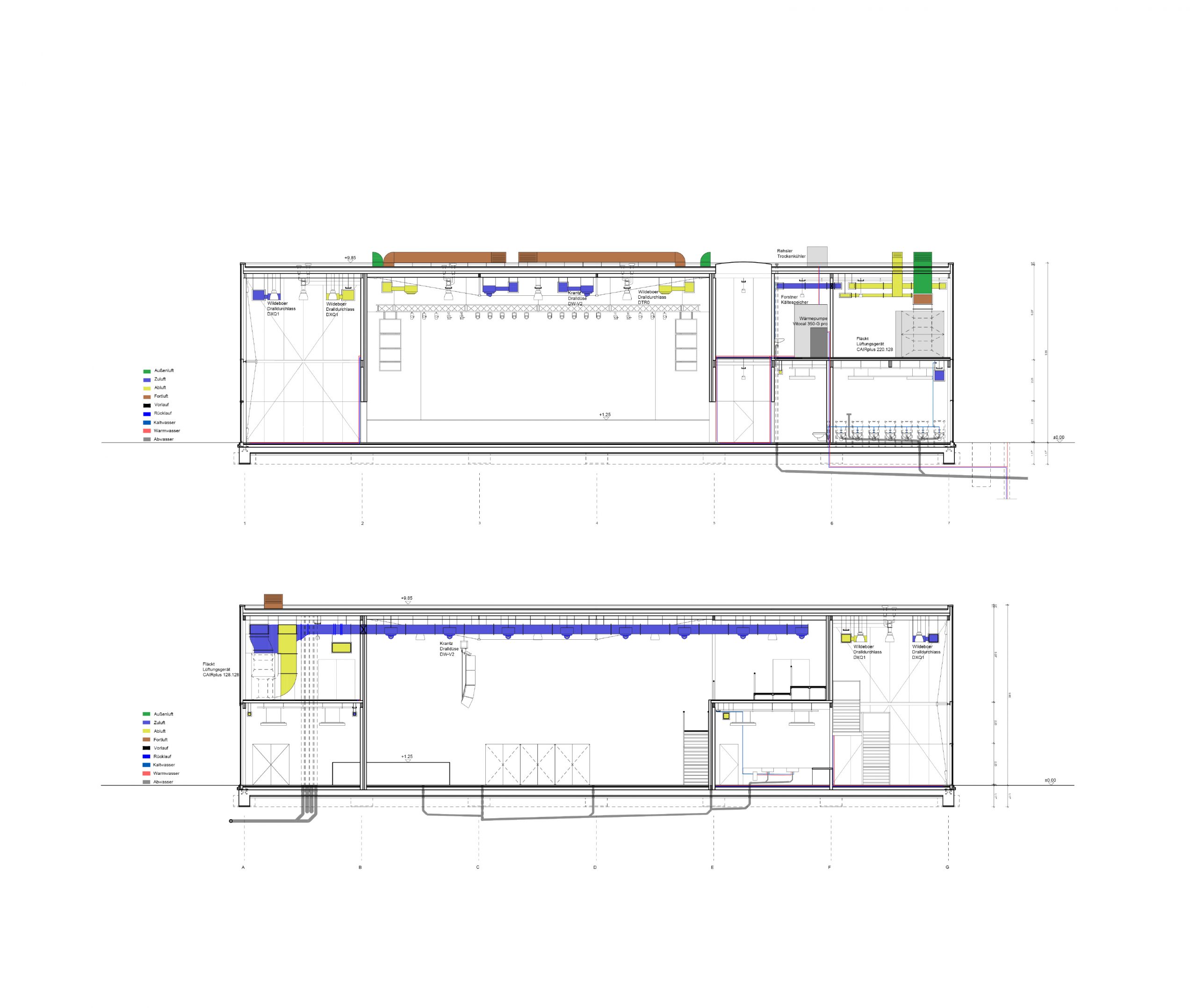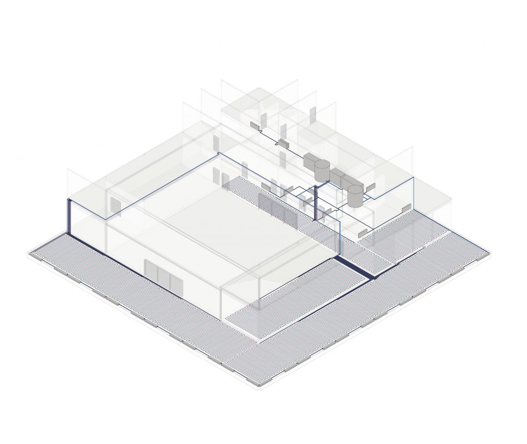 The building is designed as a two-storey steel skeleton. The pillars are formed by hot-dip galvanized square tubes and the beams are IPE beams with concrete filling.