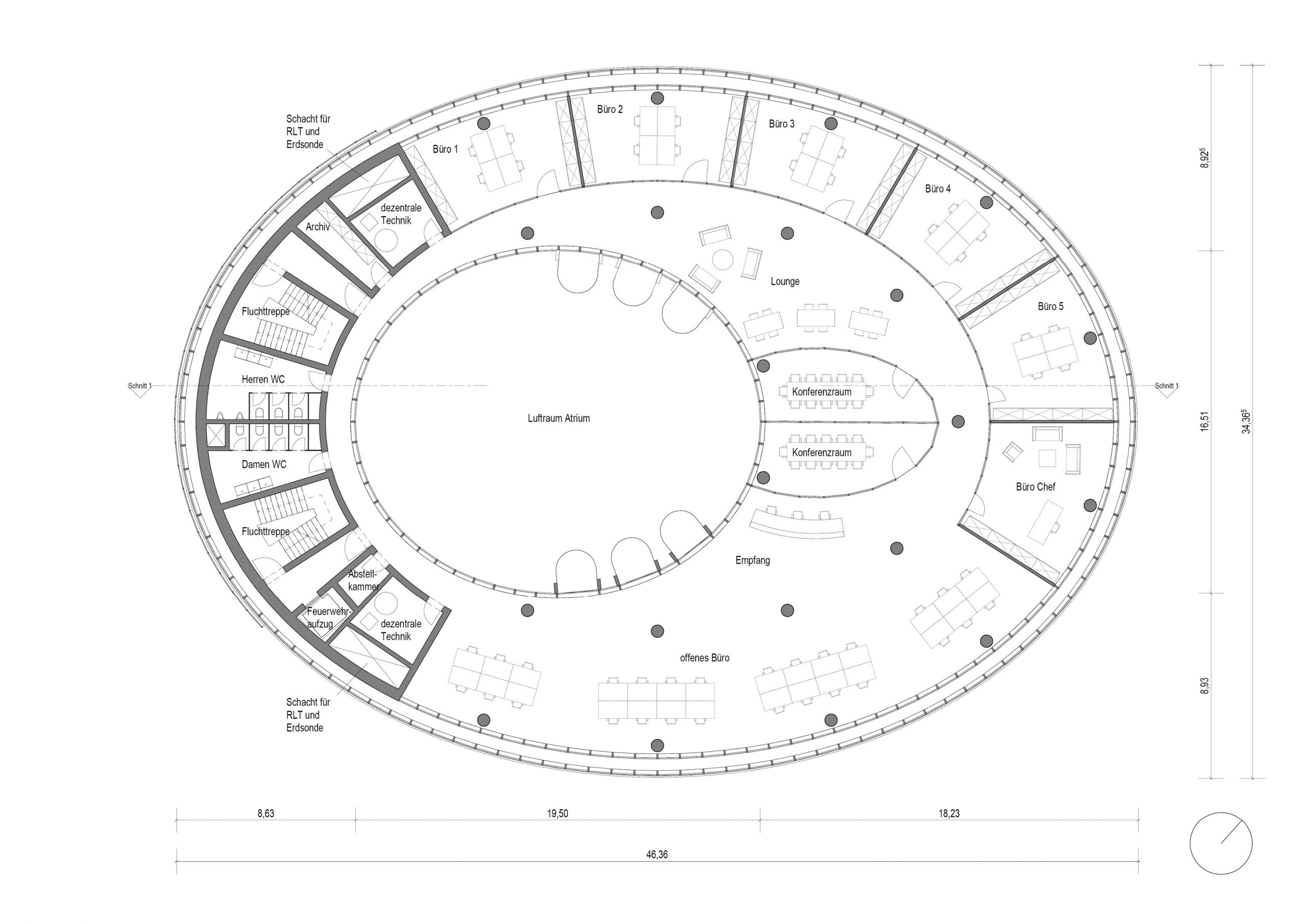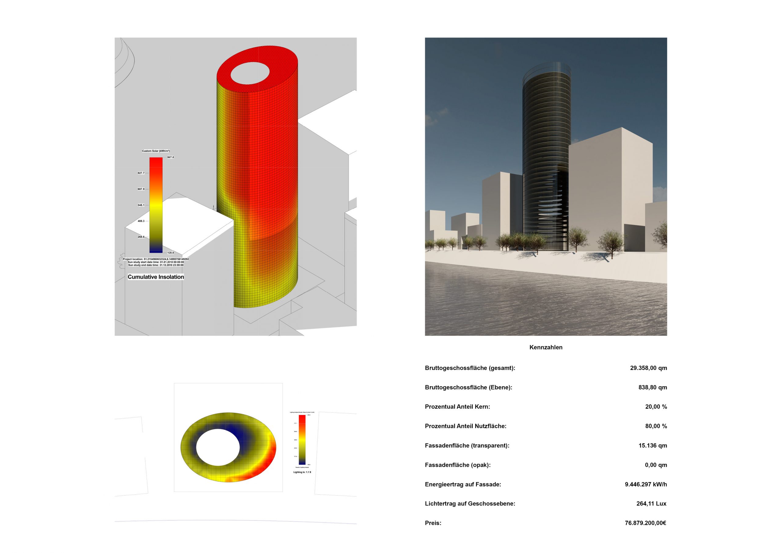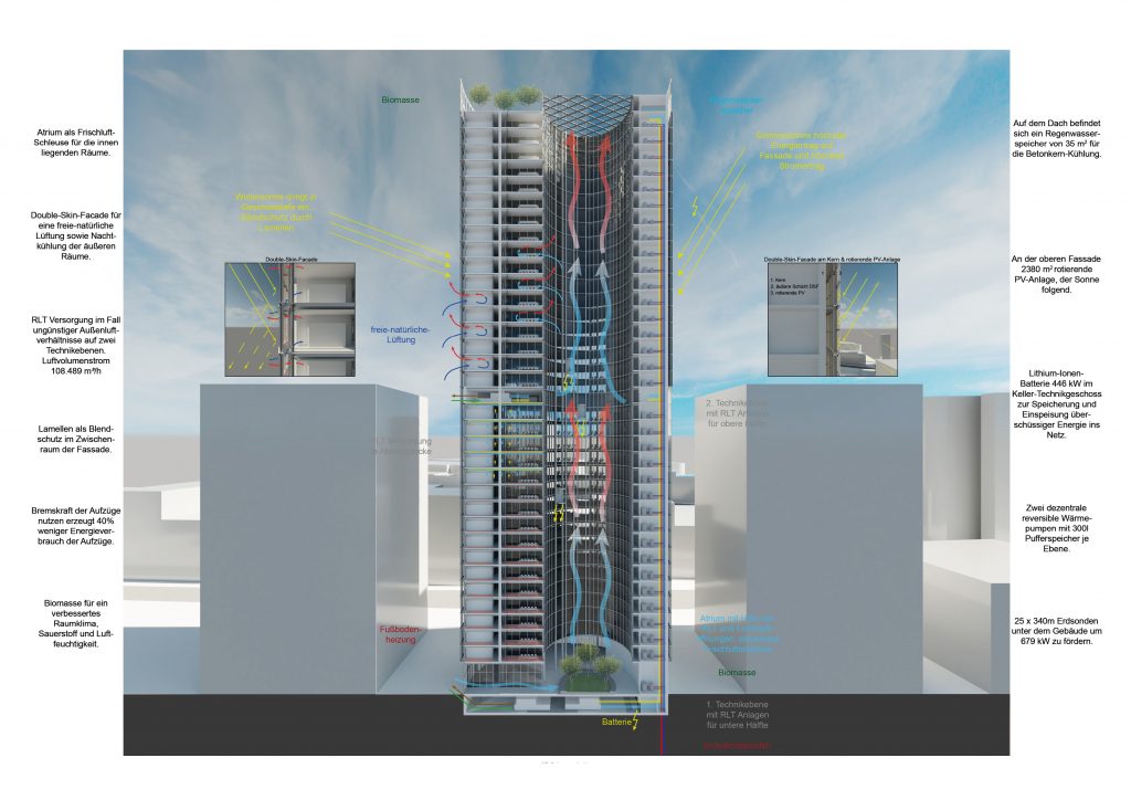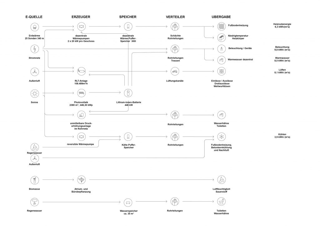 A new office building was planned to enhance the neighborhood in Düsseldorf’s Media Harbor, with a strong emphasis on resource-efficient operation. The building was designed to be particularly energy-conscious, aiming for a heating energy requirement of no more than 15 kW/m2, aligning with passive house standards. Additionally, the goal was to balance energy consumption with on-site electricity generation as much as possible, striving for a net-zero energy footprint.