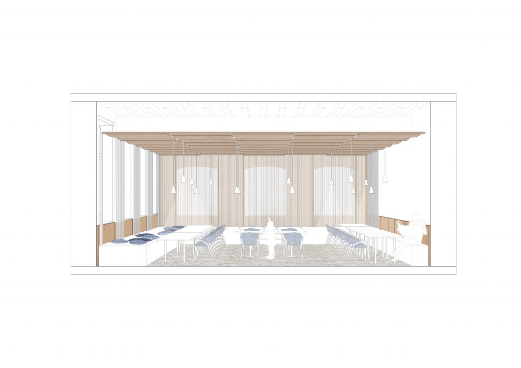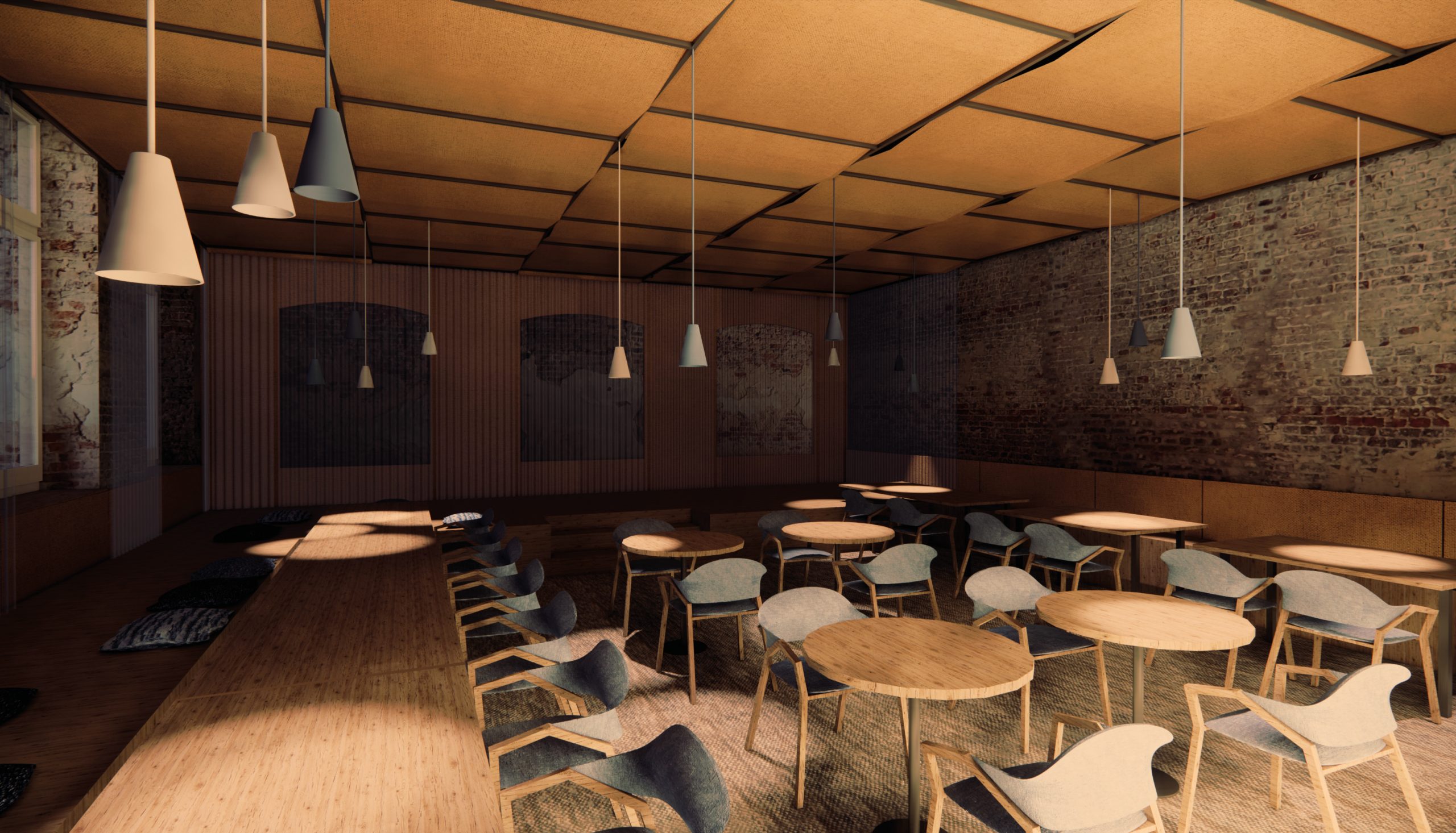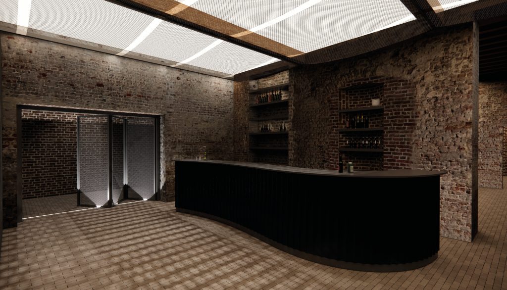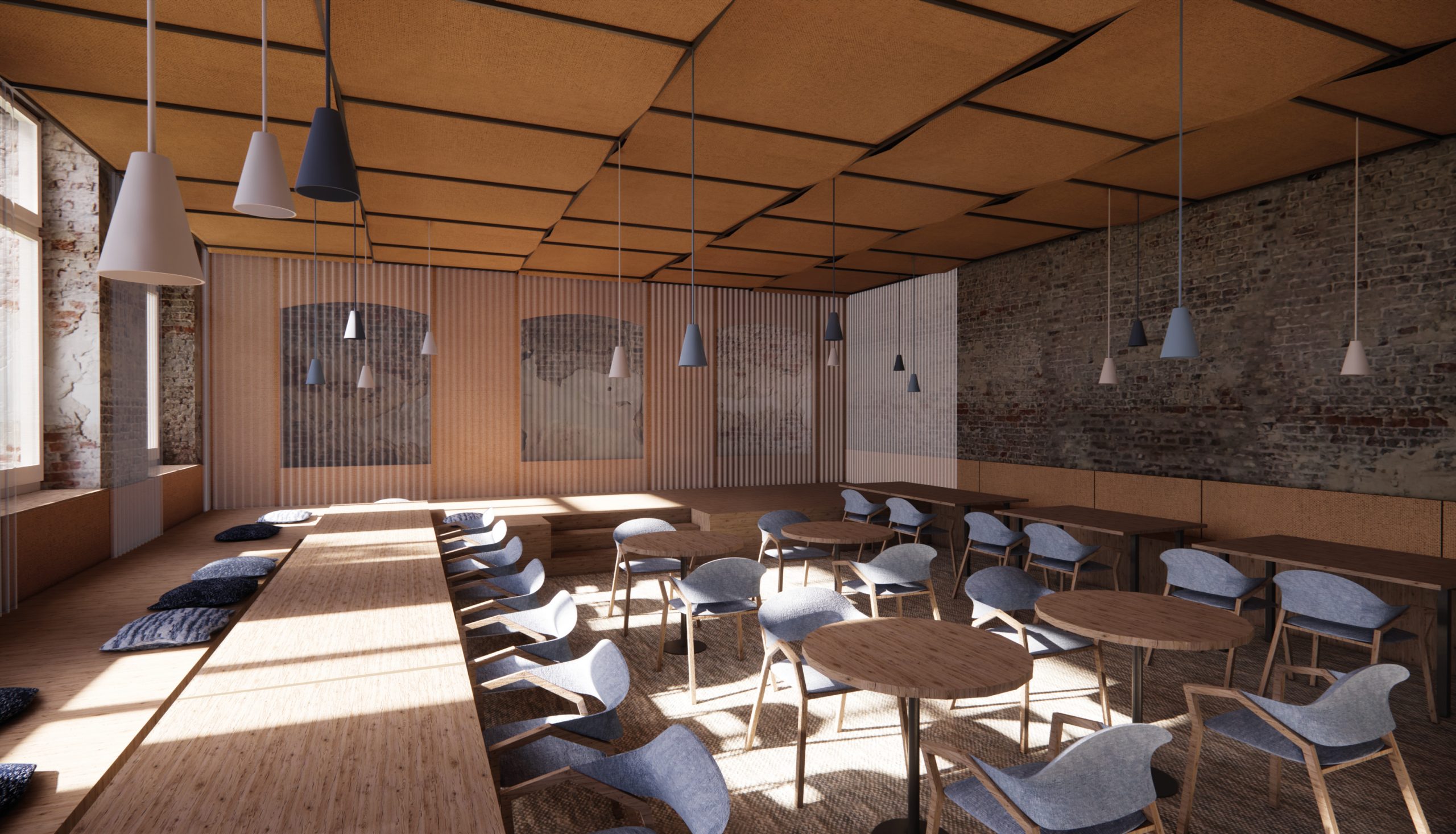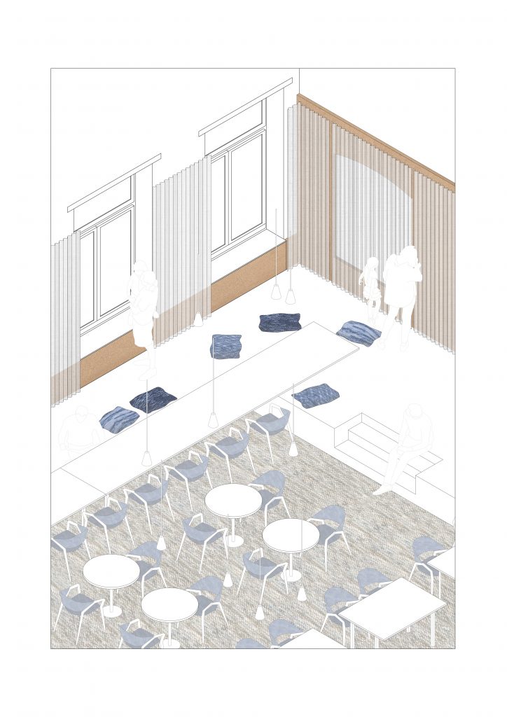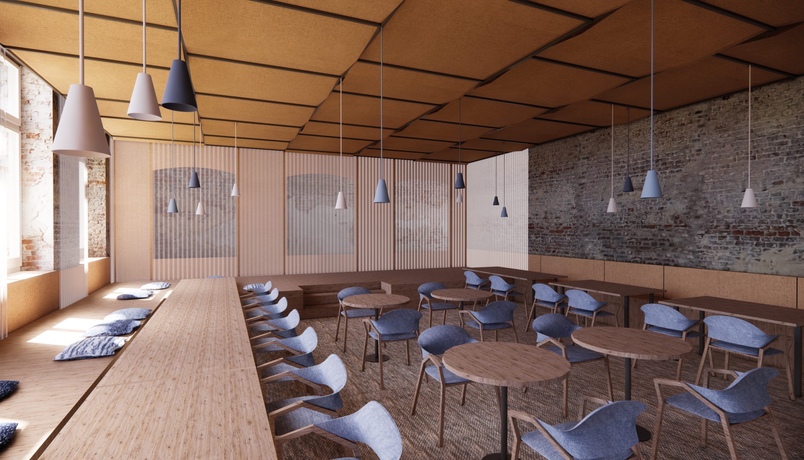 In recent years, a Dutch organization has been working to restore the monastery as a destination, café and meeting place. My design for the interior of the refectory at Hoogcruts Monastery includes the redesign of the former refectory, the access corridor and the moat area outside. My goal is to create a flexible and soft interior that tells a new story without permanently altering the existing structure, playing with the old, without overshadowing it.