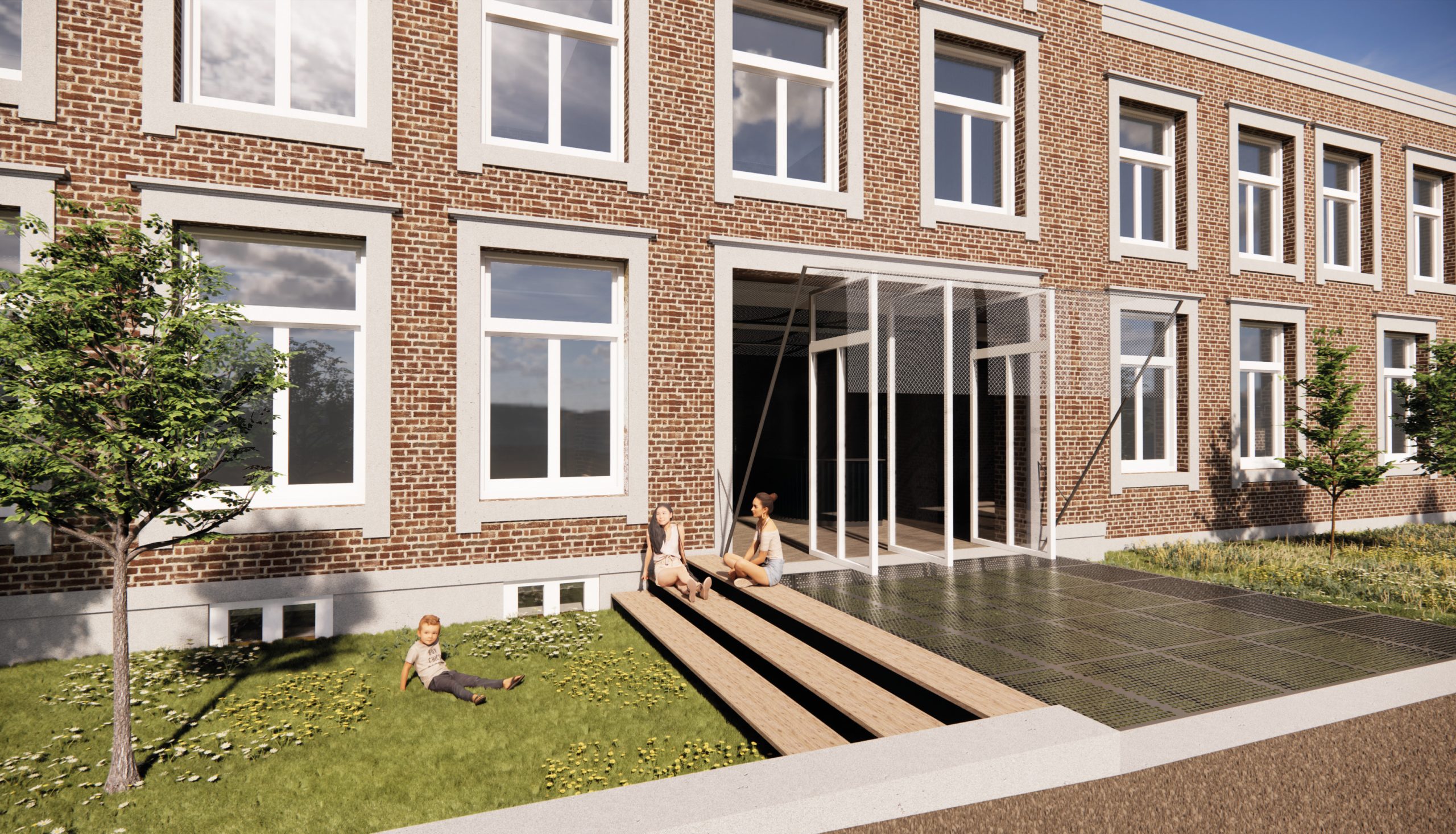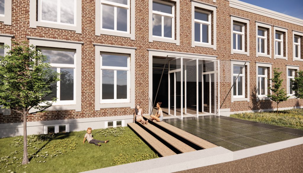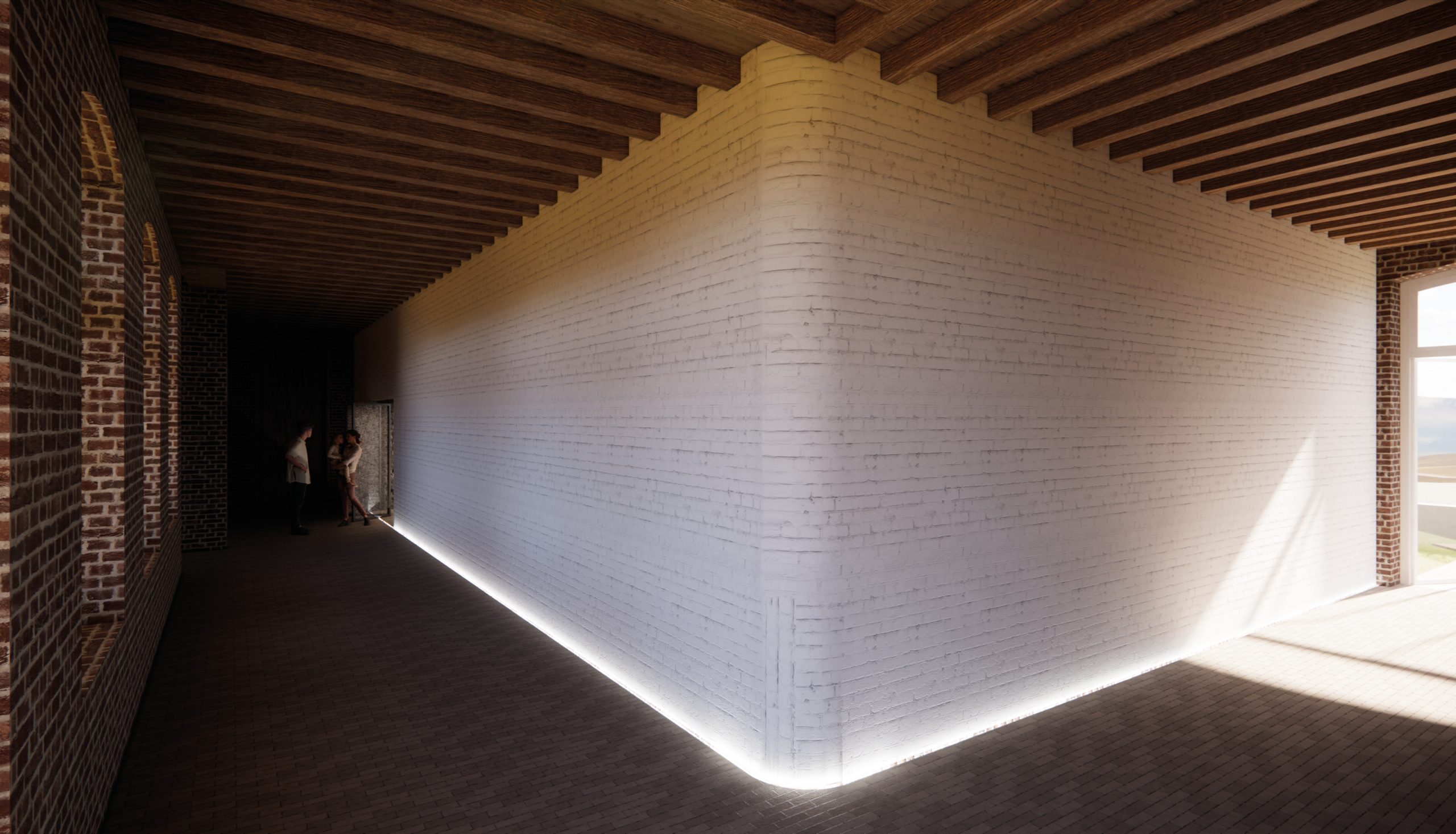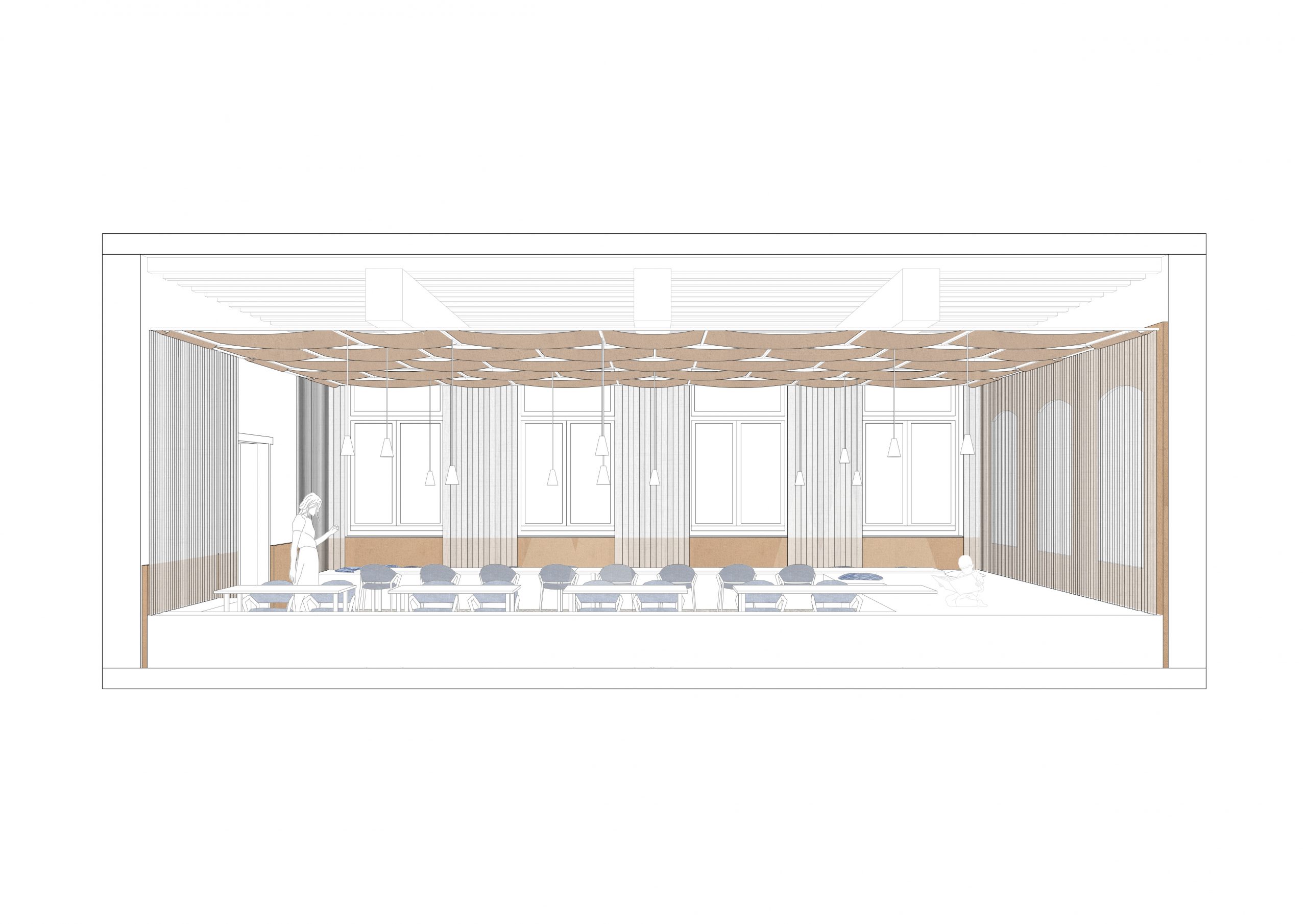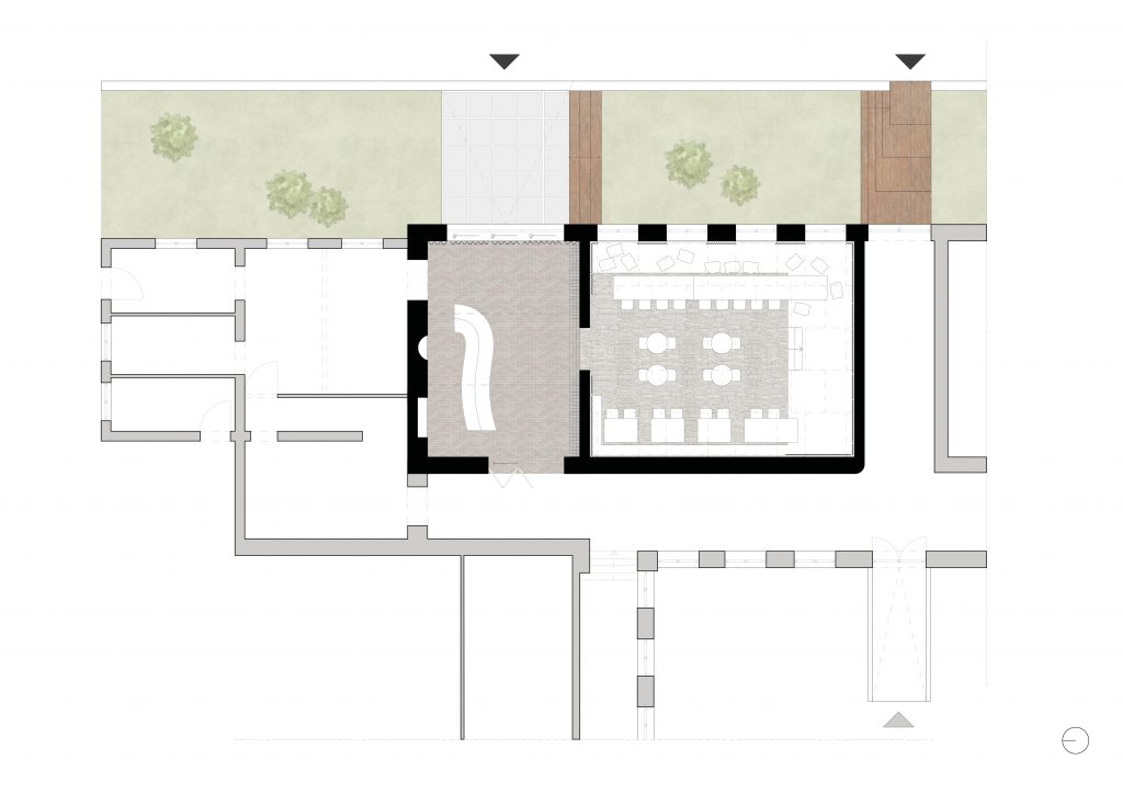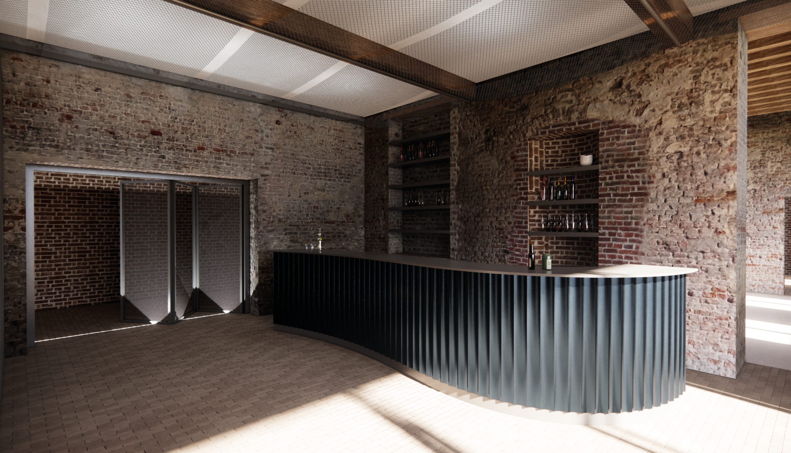 In recent years, a Dutch organization has been working to restore the monastery as a destination, café and meeting place. My design for the interior of the refectory at Hoogcruts Monastery includes the redesign of the former refectory, the access corridor and the moat area outside. My goal is to create a flexible and soft interior that tells a new story without permanently altering the existing structure, playing with the old, without overshadowing it.
