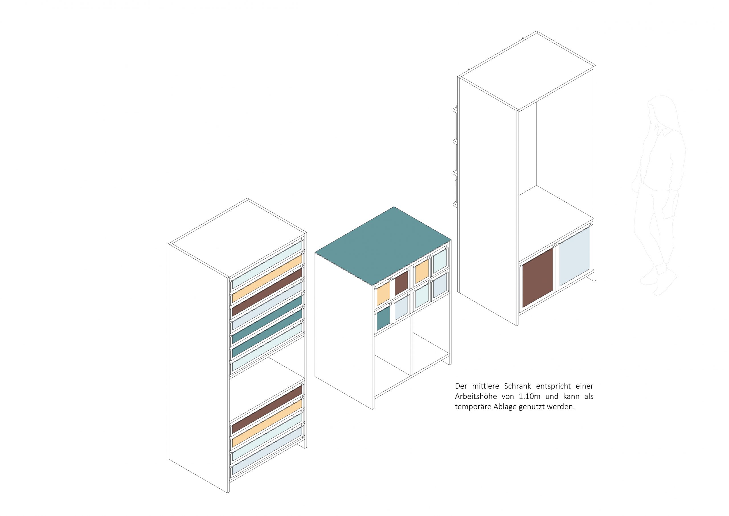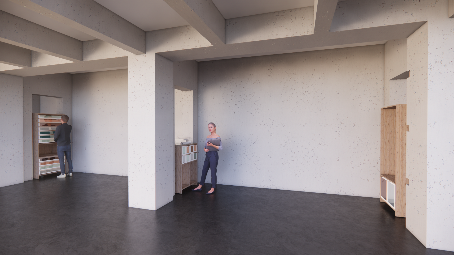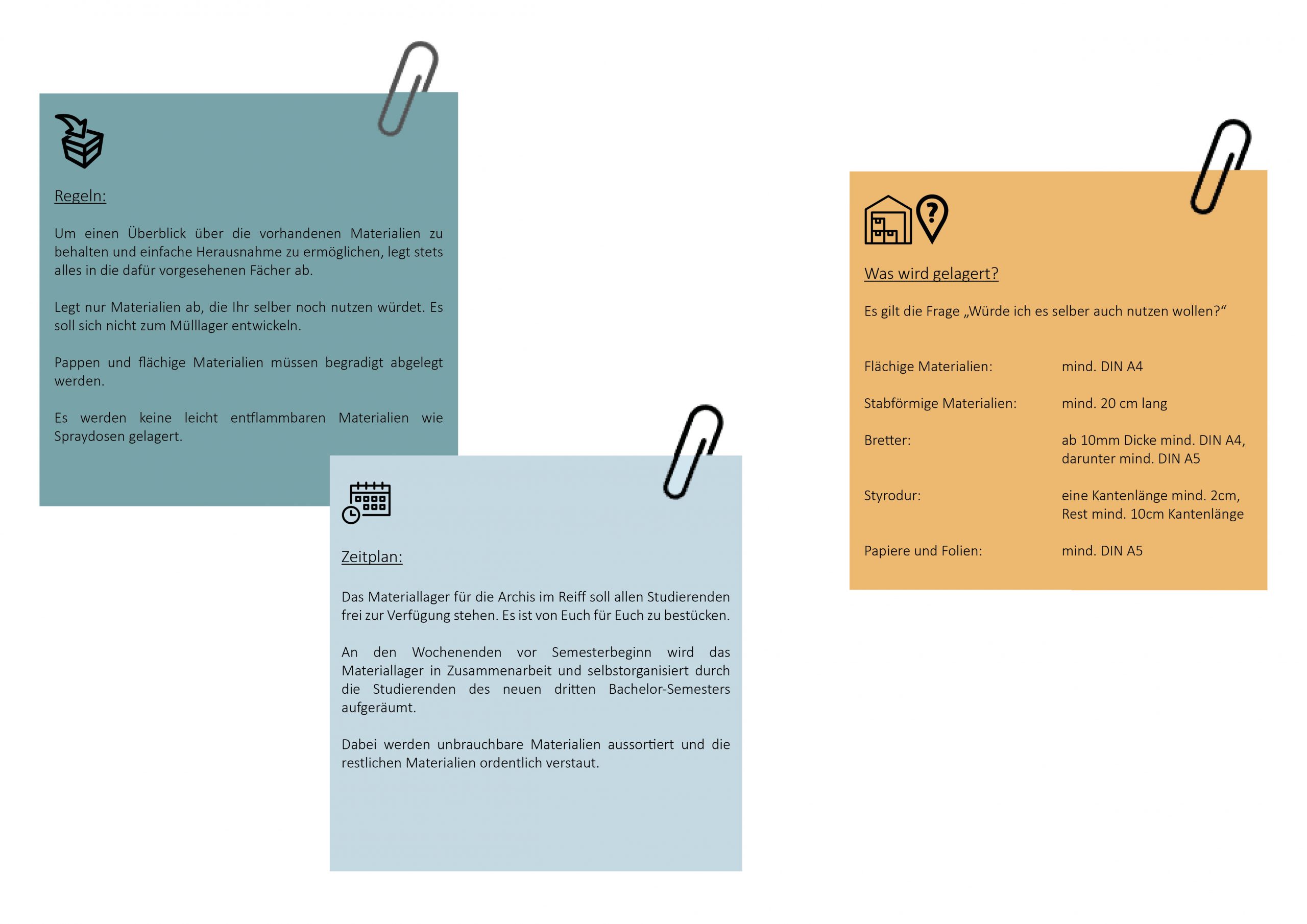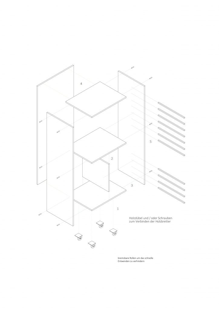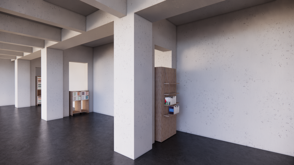 To address this issue, a material storage is proposed in the rarely used basement foyer of the Reiff museum (building of the architecture faculty). The concept involves designing mobile furniture that can be easily moved into the room for material flea markets. The design should also include a concept of usage with guidelines. For example, what size of cardboard scraps are too small to be stored? Should there be regular cleaning and decluttering sessions? How can we prevent the furniture from being stolen or moved to the upstairs workspaces? Where should each type of material be stored? What building materials will be used for the furniture, and what will the potential construction costs be?