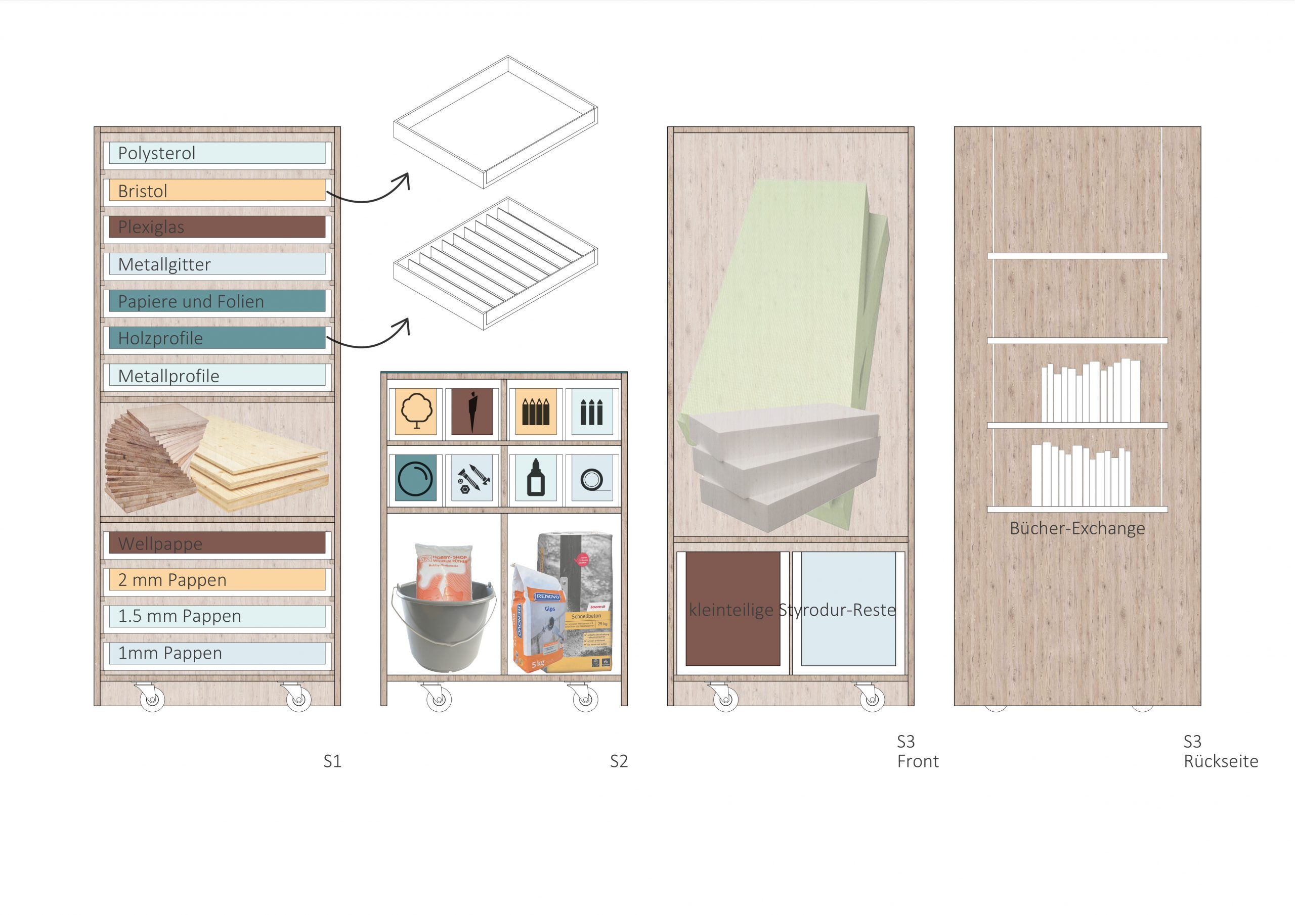 The physical model is often essential for communicating a design in architectural studies. During the construction of these models, both at the institutes and among the students, leftover materials often accumulate that could still be used. Currently, most of these materials are discarded at the end of the semester. However, if there were a central location for storing these materials, model-building supplies could be recycled, reducing costs for students.