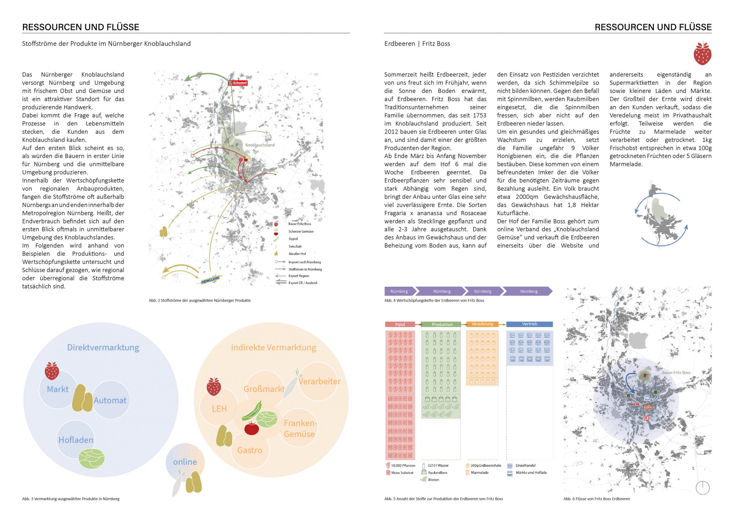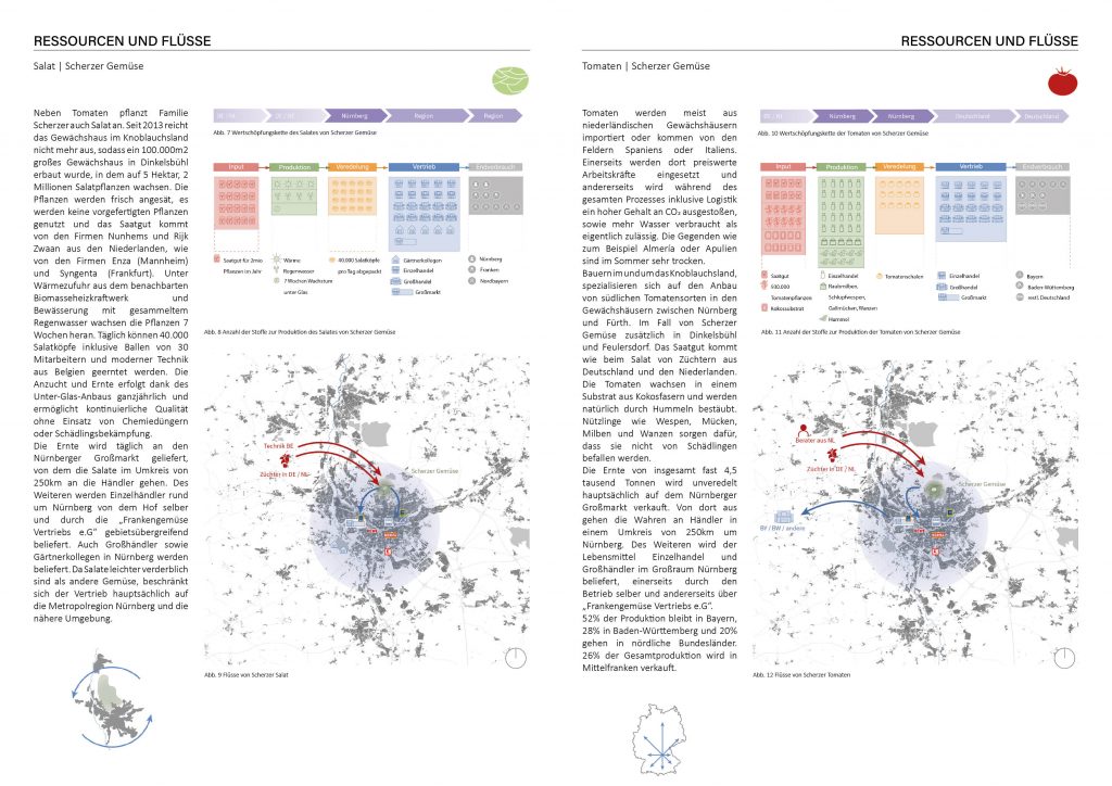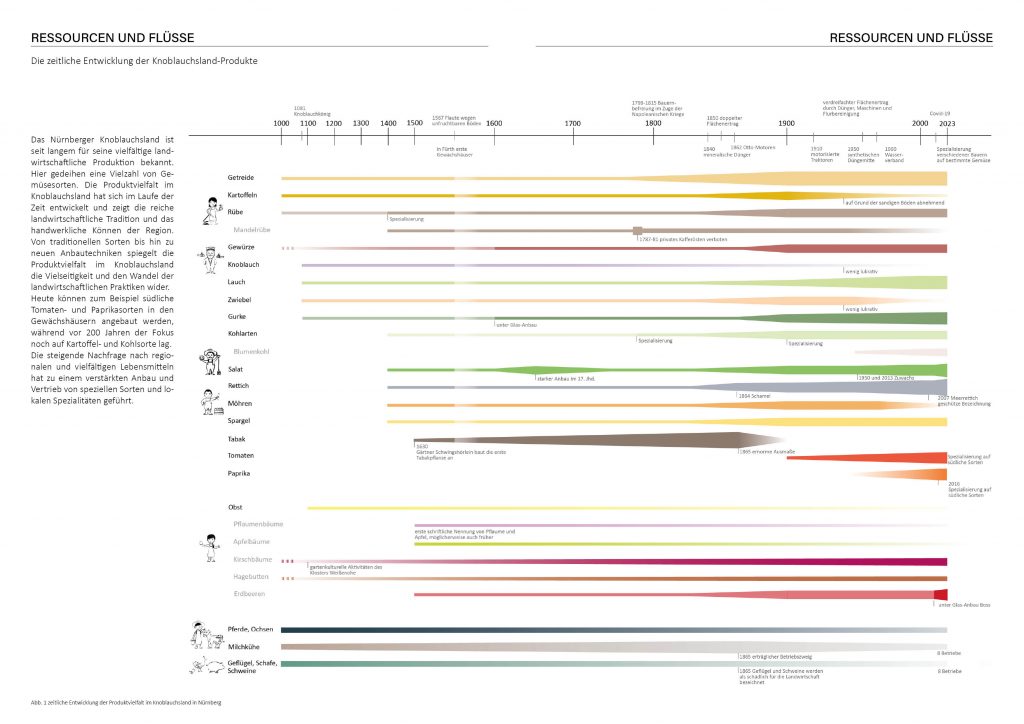 My focus lay on the chapter „Resources and Flows.“ The “Knoblauchsland” region near Nuremberg has long been known for its diverse agricultural production, with a wide variety of vegetables thriving here. The product diversity in this area has developed over time, showcasing the region’s rich agricultural tradition and craftsmanship. From traditional varieties to new cultivation techniques, the product diversity in this cultivation region reflects the versatility and evolution of agricultural practices.